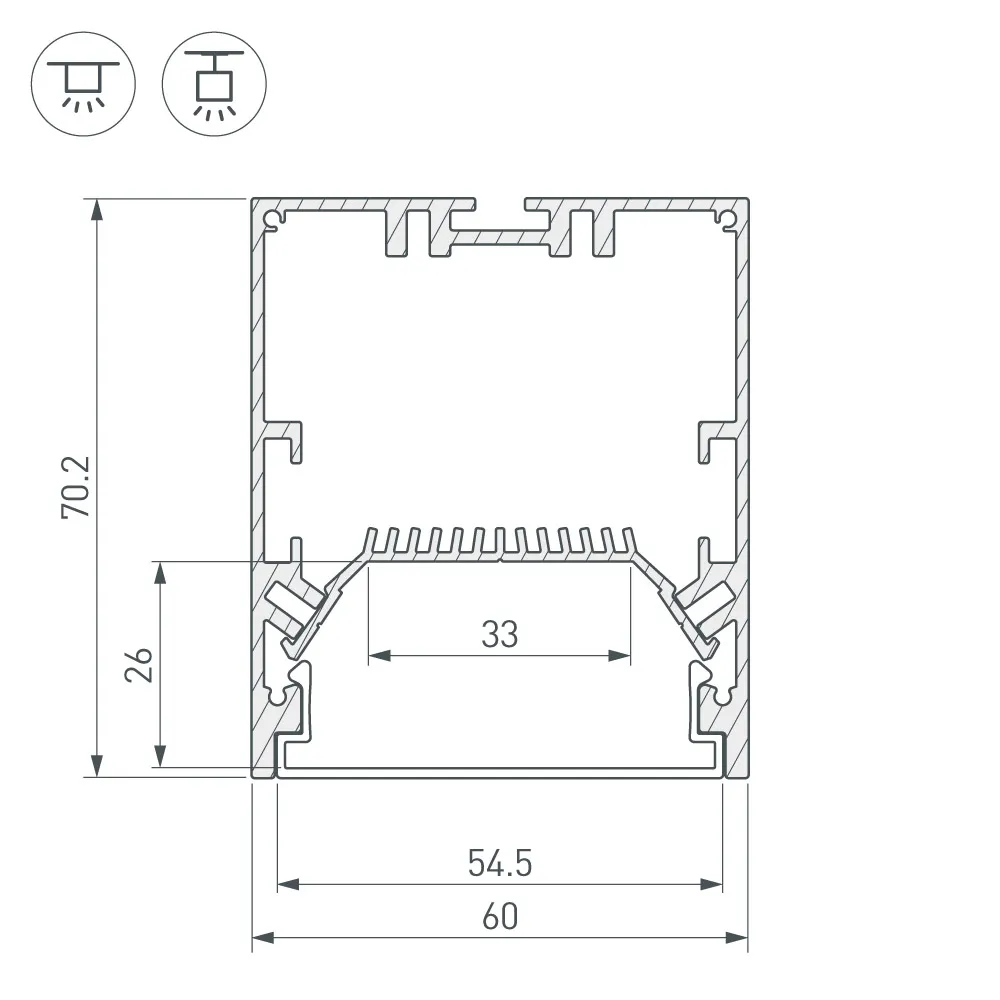 Под заказ от 50 м. Алюминиевый анодированный профиль для светодиодных лент и линеек. Габаритные размеры (L×W×H): 2000x60x70 мм. Ширина площадки для ленты 33 мм. Отсек для БП 47х29 мм. Экраны, заглушки и другие аксессуары приобретаются отдельно. Цена за 1 метр.