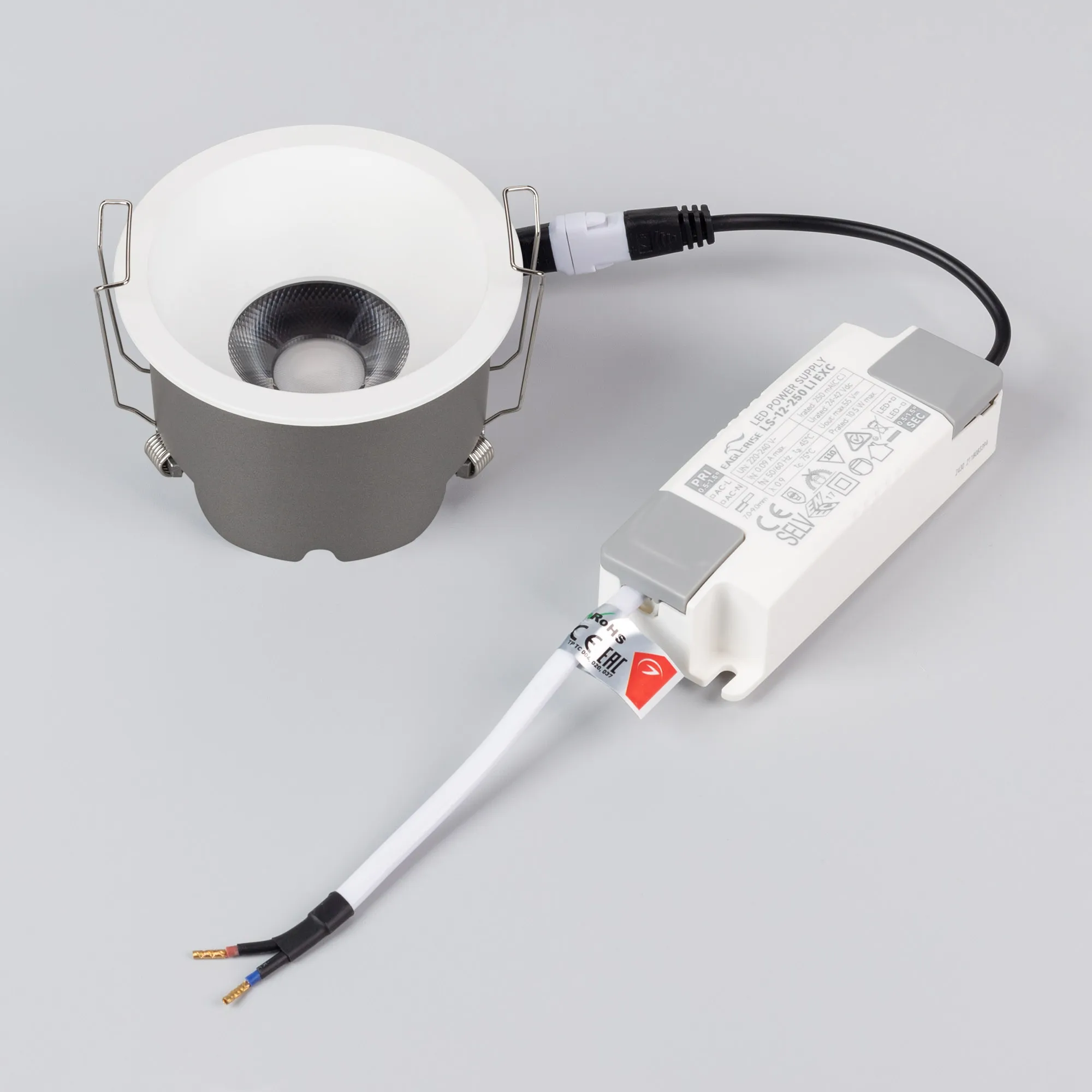 Встраиваемый светильник даунлайт. Мощность 10 Вт, св. поток 980 лм, 98 лм/Вт, дневной 4000 K, CRI>90, угол 50°, напряжение питания 230 В. Белый круглый корпус из алюминия, степень защиты IP20. Размер: диаметр 82 мм, высота 53 мм. Монтаж встраиваемый, установочное отверстие: диаметр 75 мм. UGR<14. Драйвер 30-42 В, 250 мА, пульсация <2%.
