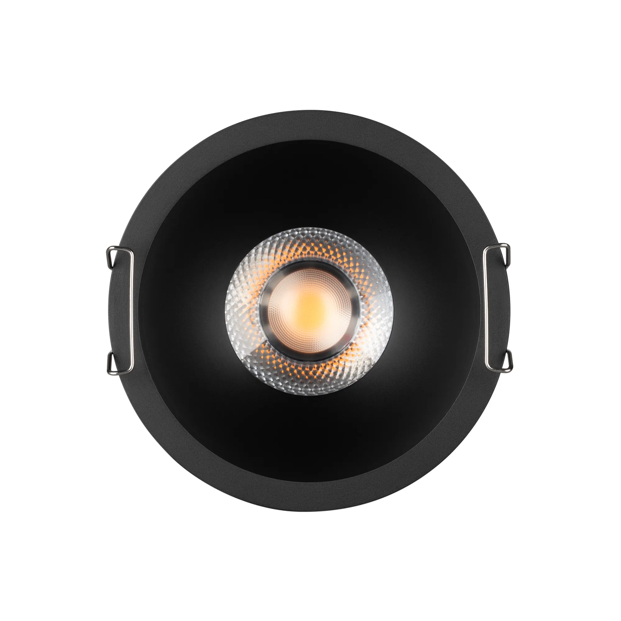 Встраиваемый светильник даунлайт. Мощность 15 Вт, св. поток 1260 лм, 84 лм/Вт, тёплый 3000 K, CRI>90, угол 24°, напряжение питания 230 В. Чёрный круглый корпус из алюминия, степень защиты IP20. Размер: диаметр 106 мм, высота 63 мм. Монтаж встраиваемый, установочное отверстие: диаметр 95 мм. UGR<14. Драйвер 27-40 В, 350 мА, пульсация <2%.